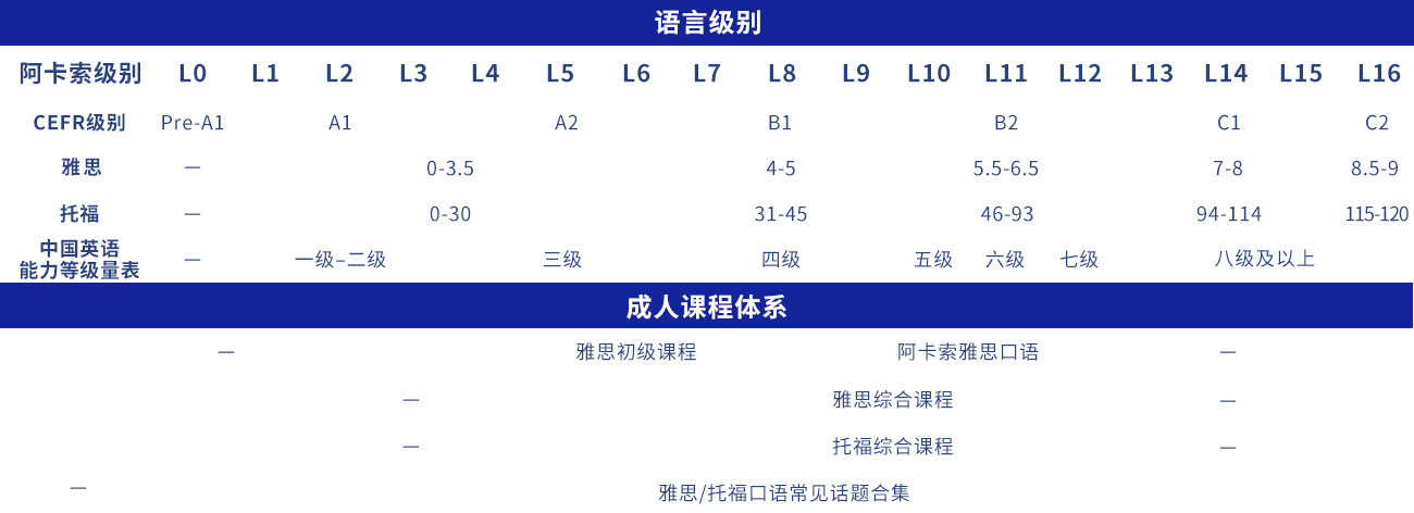 阿卡索英语学习进阶体系,从入门级到专家级共17个级别,完整对标欧洲CEFR级别、托福、雅思、托业等国际通用的英语级别体系与测试,帮助学员清晰定位自己的语言水平,量化成长进程。